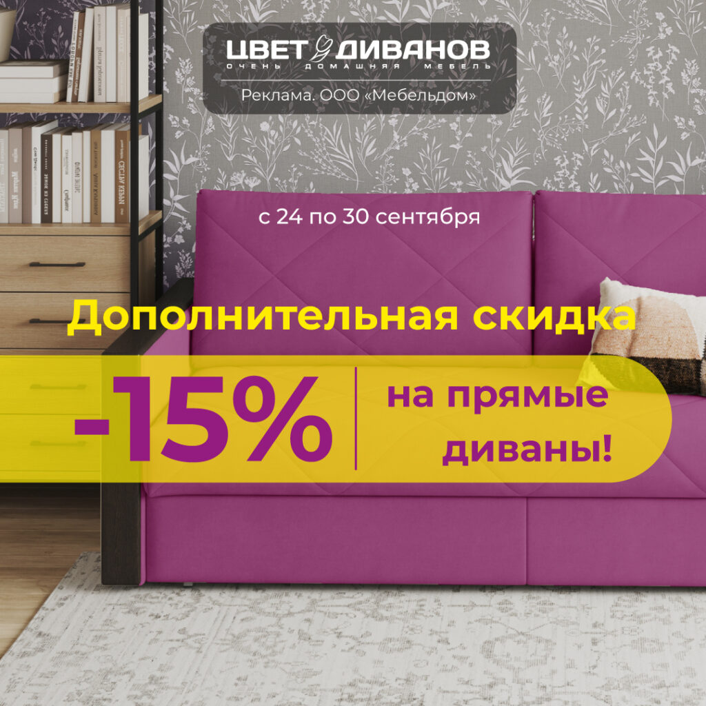 Дополнительная скидка 15% на прямые модели в салоне «Цвет диванов» актуальна до конца сентября!