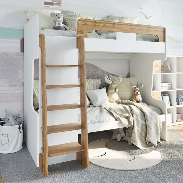 Двухъярусная кровать «Аллегро» займёт центральное место в интерьере детской. Приятное сочетание белых стенок, древесного декора панелей и лестницы наполнит пространство комнаты светом и теплом.