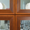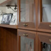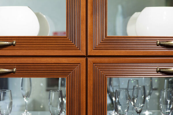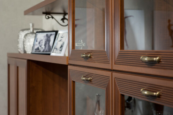 - Фасады рамочной конструкции из гребенчатого профиля МДФ, окутанные бумагой с «финиш- эффектом» в цвете «Клен Старый» с нанесением испанского лака и патины.