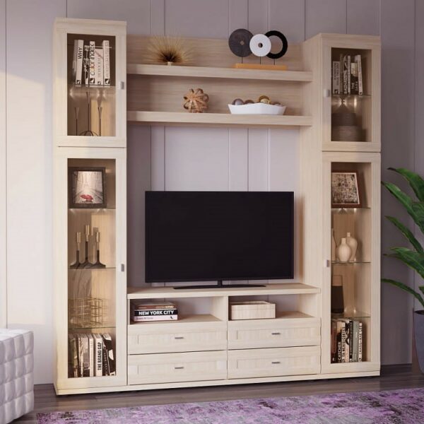 В комплект №8 гостиной «Орнета» входят два шкафа, тумба для ТВ и техники, широкая полка.