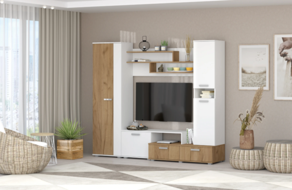 Гостиная Юна станет отличным вариантом для обустройства ТВ-зоны и хранения всех необходимых вещей. Открытые полки позволят оживить обстановку аксессуарами, фотографиями в рамках и комнатными растениями. Для хранения одежды предусмотрено вместительное отделение со штангой для вешалок и антресольной полкой, а также несколько закрытых отделений.