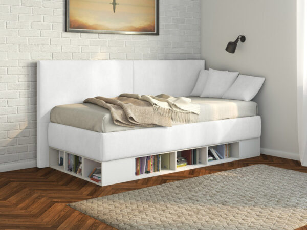 Кровать-тахта с необычными боковинами и набором ниш для хранения различных вещей. Вместительный ящик скрывается под подъемным механизмом. Стильная и необычная кровать станет украшением вашего интерьера.