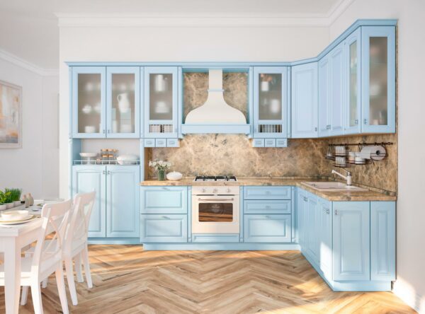 Фасады изготовлены из плиты МДФ, покрытой эмалью. Разнообразие цветовых решений делает кухню универсальной для любого интерьера.