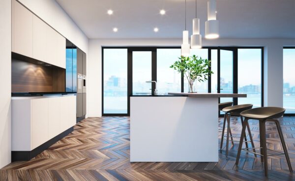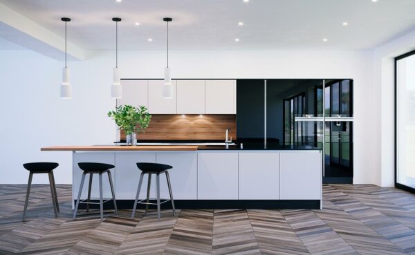 Такое покрытие удивительно практично, а простые формы модулей делают кухню идеальной для встраивания современной техники.