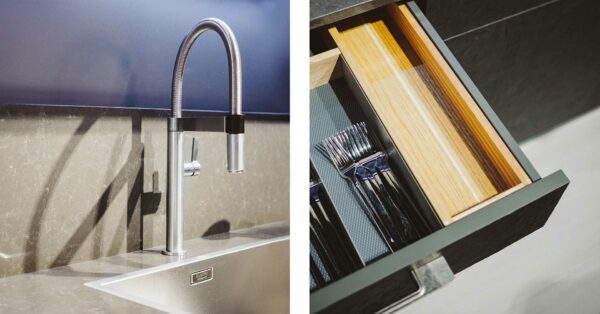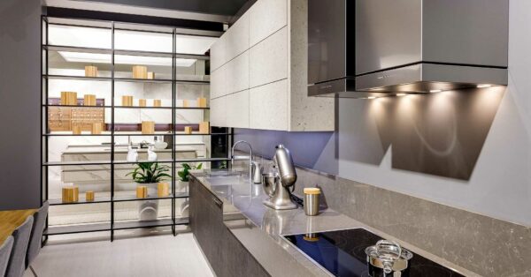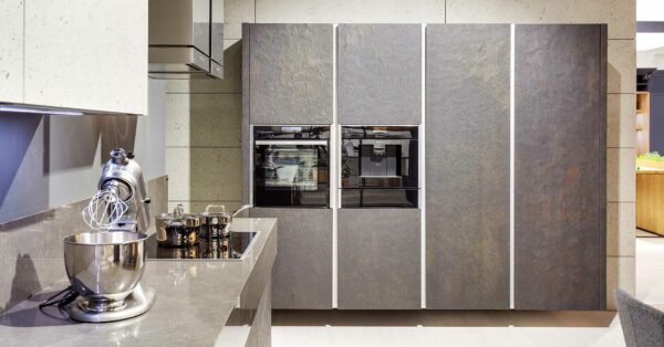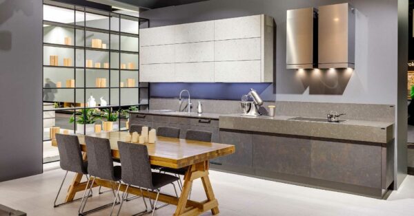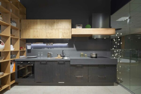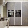 Комбинация поверхностей из кварцевого сланца и натурального дерева подчеркивает индивидуальность кухни. Коллекция модели пополнена актуальной новинкой в индустриальном стиле – фасадами из натурального бетона .