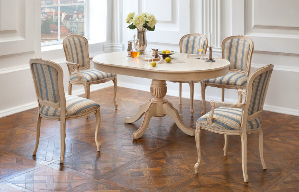 Эта шикарная обеденная группа представляет собой европейский дворцовый стиль. Помпезность, множество сложных изгибов и декора — всё это призвано подчеркнуть роскошь интерьера.