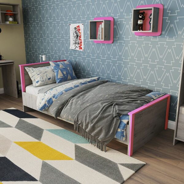 Комфортные размеры спального места и надёжное основание на базе анатомической решётки обеспечивают спокойный отдых ребёнка. Ярким акцентом в дизайне кровати выступают розовые планки, добавляющие цвета и настроения в интерьер.