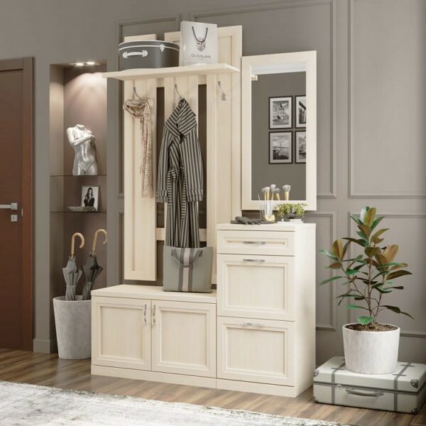 На вешалке с тремя трёхрожковыми крючками и полкой поместится вся необходимая верхняя одежда и головные уборы. Внутри двух обувниц достаточно отделений для хранения сезонной обуви. Прихожая в лаконичном дизайне прекрасно подойдет для современного интерьера.