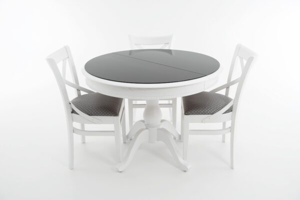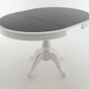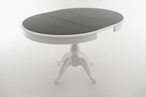 Чтобы разложить стол, нужно раздвинуть две части столешницы, достать из подстолья дополнительную вставку «бабочка» и установить между крыльев столешницы. Синхронный механизм трансформации позволяет раздвинуть столешницу одной рукой.