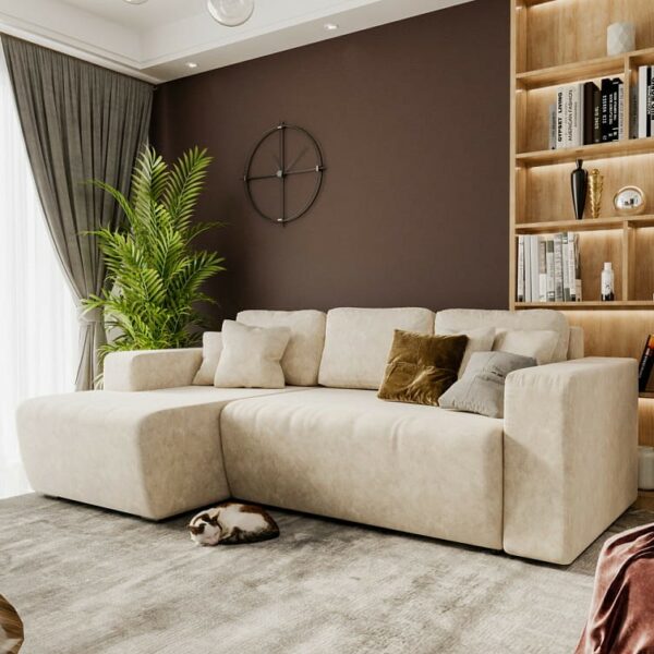 Угловой диван «Пуэрто» — тот самый вариант, если нужен универсальный дизайн, глубокая посадка, просторное спальное место и вместительный ящик для белья в одном изделии.